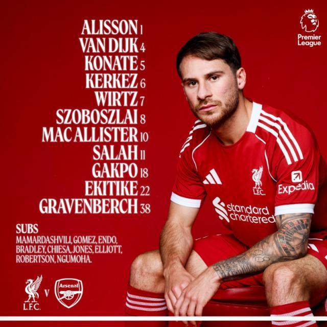 利物浦首发:阿利松、范戴克、科纳特、凯尔凯兹、维尔茨、索博斯洛伊、麦卡利斯特、萨拉赫、哈克波、埃基蒂克、赫拉芬贝赫
