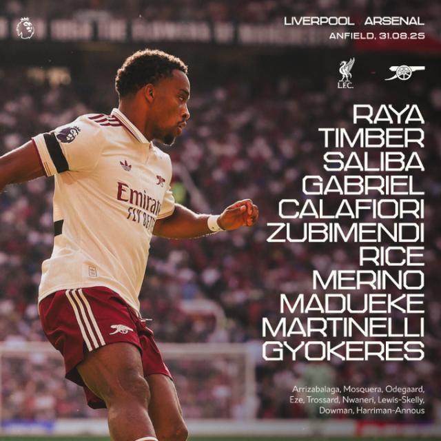 阿森纳首发:拉亚、廷伯、萨利巴、加布里埃尔、卡拉菲奥里、苏维门迪、赖斯、梅里诺、马杜埃凯、马丁内利、哲凯赖什